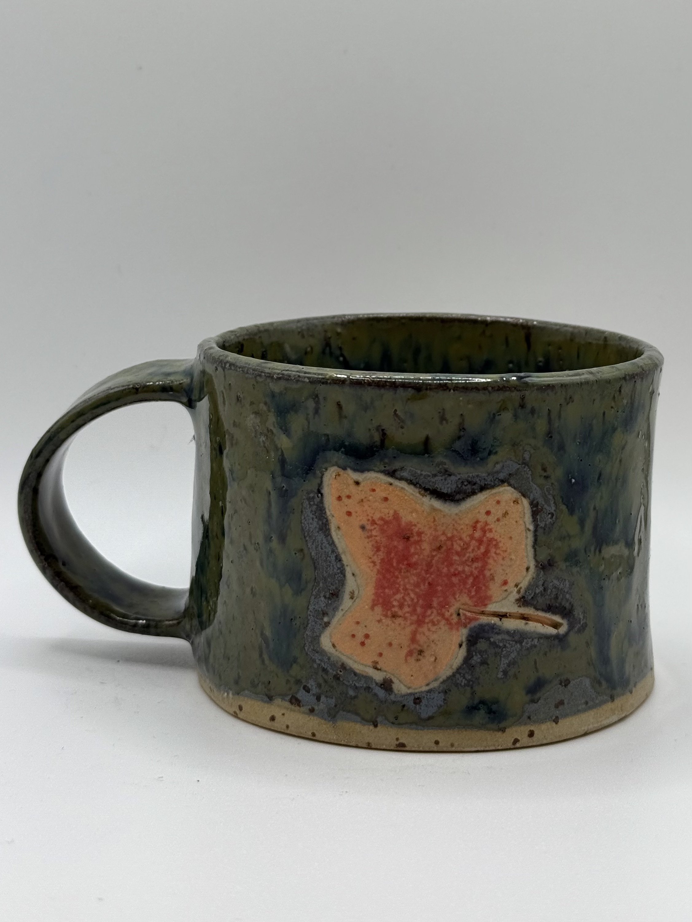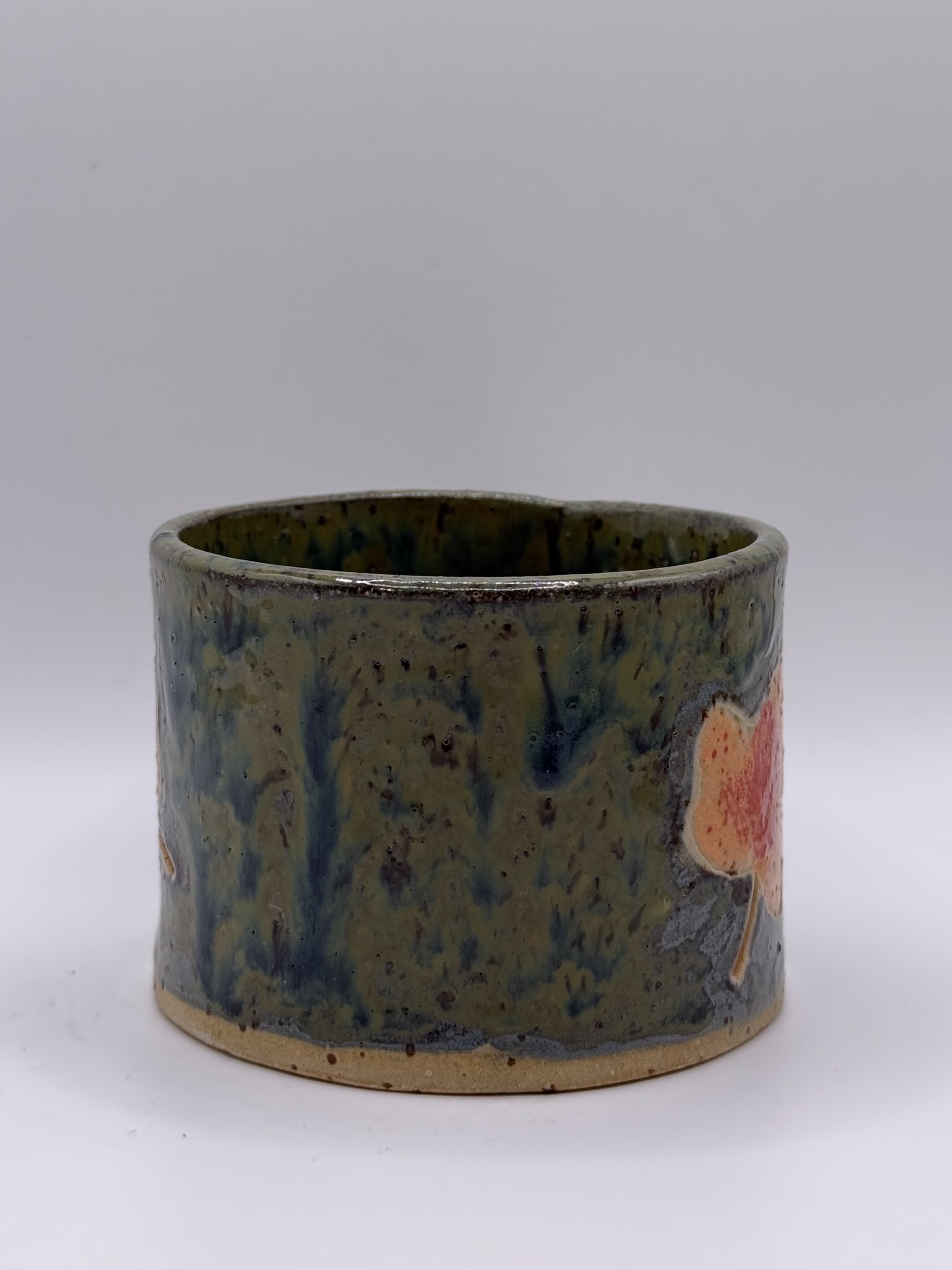Ręcznie wykonany kubek z ręcznie zebranymi i odciśniętymi liśćmi bluszczu.
