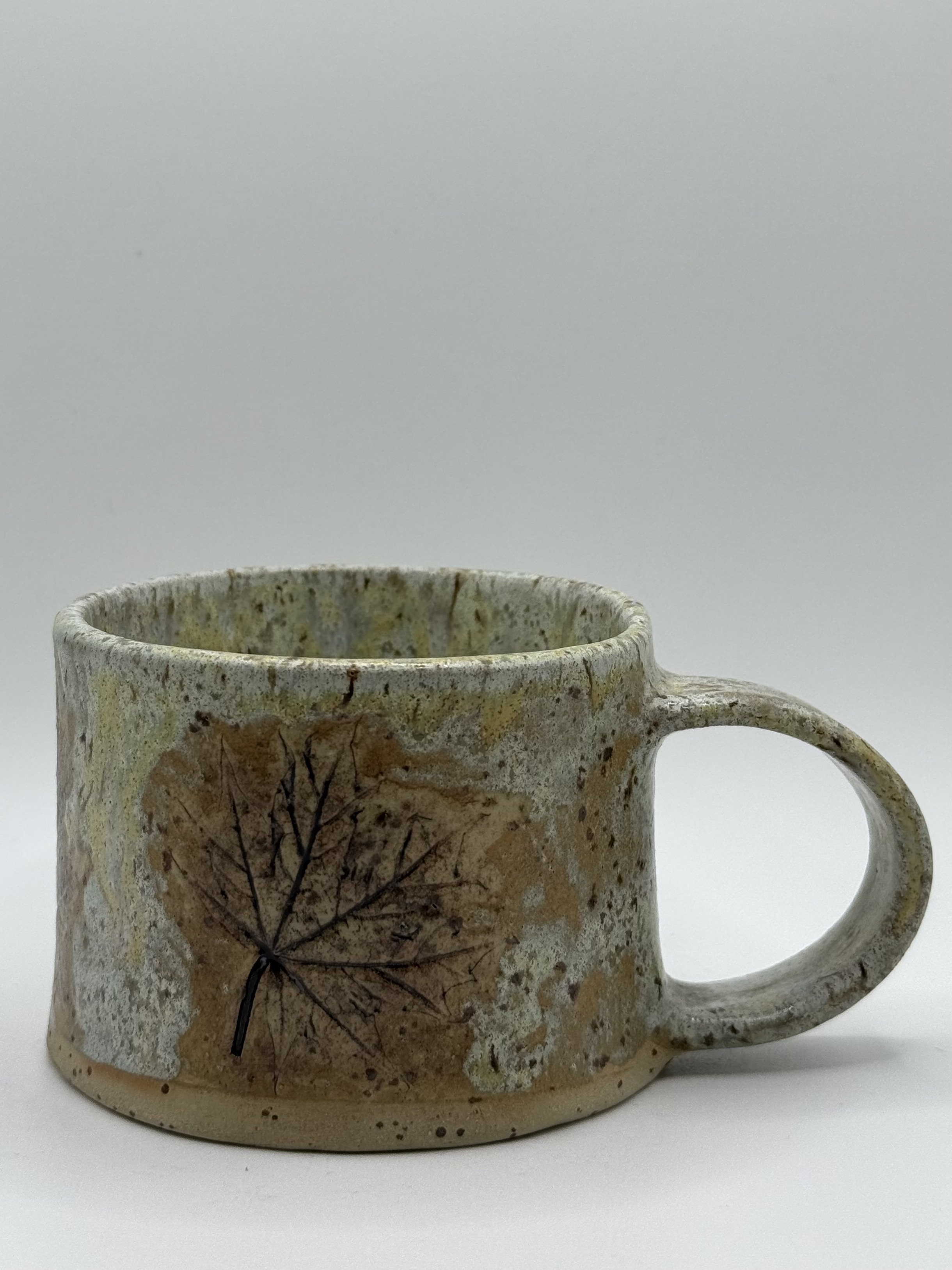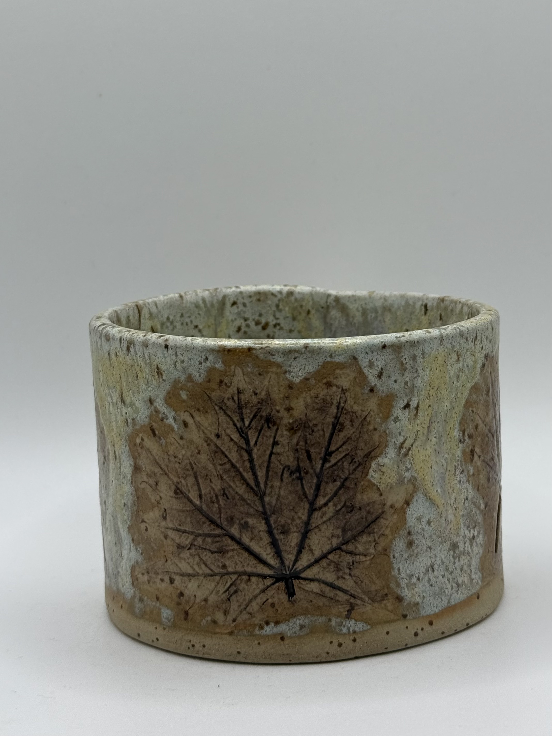 Ręcznie wykonany kubek z ręcznie zebranymi i odciśniętymi liśćmi klonu