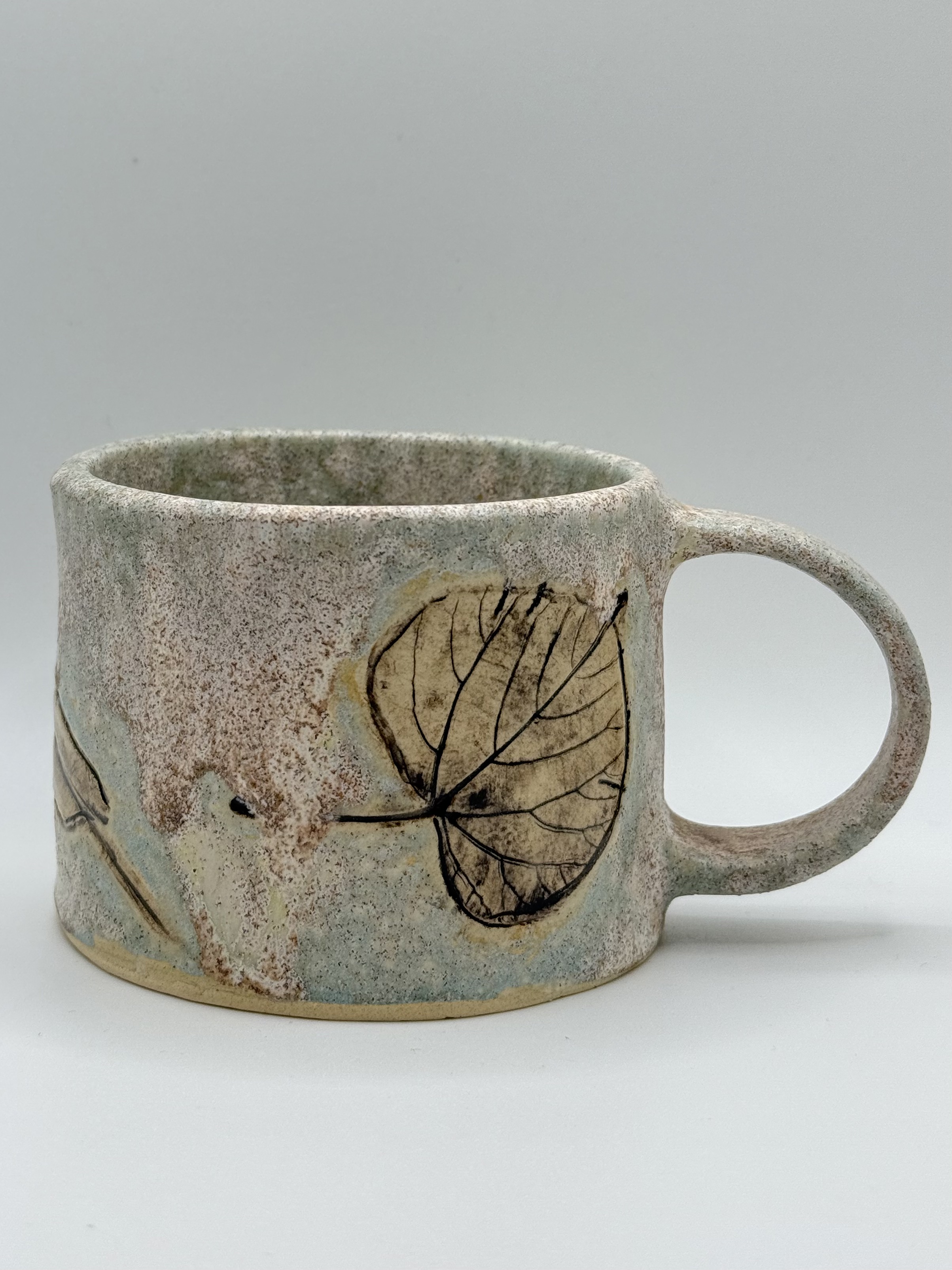 Bardzo wygodny, większy kubek z odciśniętymi naturalnymi liśćmi i kwiatostanem lipy.